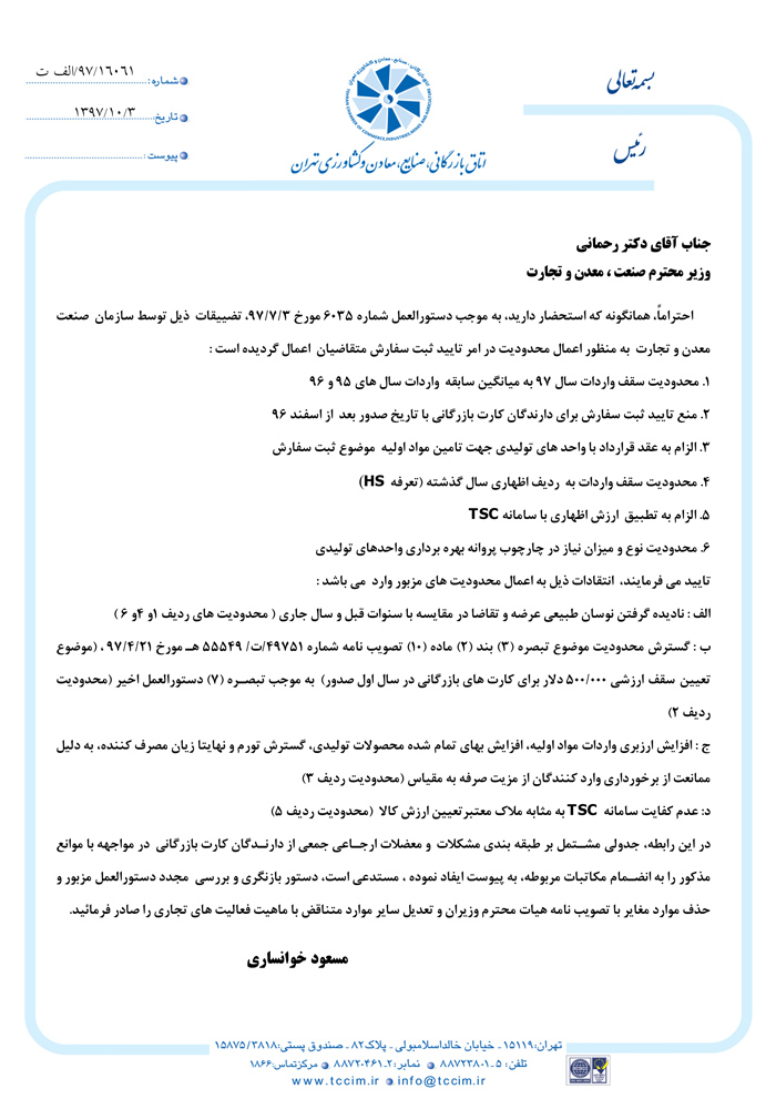 در نامه مسعود خوانساری به رضا رحمانی، به برخی موانع ایجاد شده پیشروی فعالان اقتصادی، از جمله محدودیت سقف واردات سال 97 به میانگین سابقه واردات سالهای 95 و 96 و نیز منع تایید ثبت سفارش برای دارندگان کارت بازرگانی با تاریخ صدور بعد از اسفند 96، اشاره شده و آمده است: «بر اساس دستورالعملهای سازمان صنعت، معدن و تجارت، الزام به عقد قرارداد با واحدهای تولیدی برای تامین مواد اولیه موضوع ثبتسفارش، محدودیت سقف واردات به ردیف اظهاری سال گذشته، الزام به تطبیق ارزش اظهاری با سامانه TSC و همچنین، محدودیت نوع و میزان نیاز در چارچوب پروانه بهرهبرداری واحدهای تولیدی، عملا فعالیت بنگاههای بخشخصوصی را دچار چالش جدی کرده است».