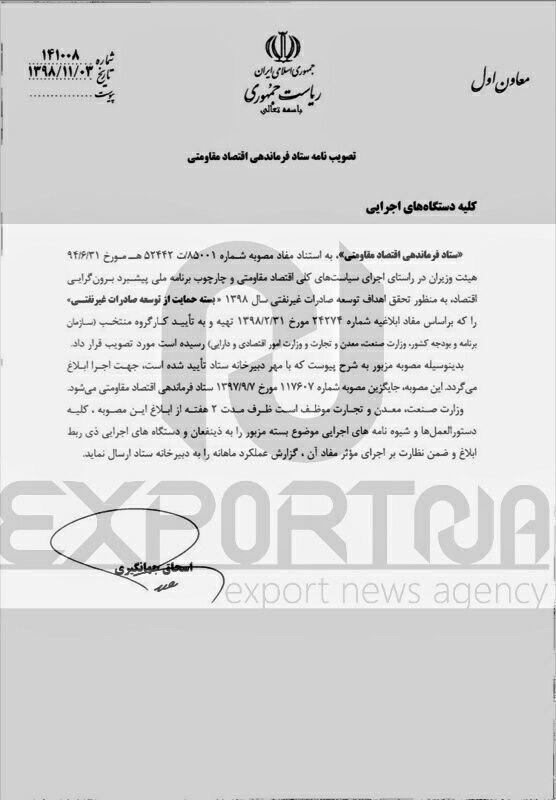 «ستاد فرماندهی اقتصاد مقاومتی» به استناد مفاد مصوبه شماره ۸۵۰۰۱/ت۵۲۴۴۲ ه- مورخ ۹۴/۶/۳۱ هیات وزیران در راستای اجرای سیاستهای کلی اقتصاد مقاومتی و چارچوب برنامه ملی پیشبرد برونگرایی اقتصاد، به منظور تحقق اهداف توسعه صادرات غیرنفتی سال ۱۳۹۸ «بسته حمایت از توسعه صادرات غیرنفتی» را که بر اساس مفاد ابلاغیه شماره ۲۴۲۷۴ مورخ ۱۳۹۸/۲/۳۱ تهیه و به تائید کارگروه منتخب(سازمان برنامه و بودجه کشور، وزارت صنعت، معدن و تجارت و وزارت امور اقتصادی و دارایی) رسیده است، مورد تصویب قرار داد.