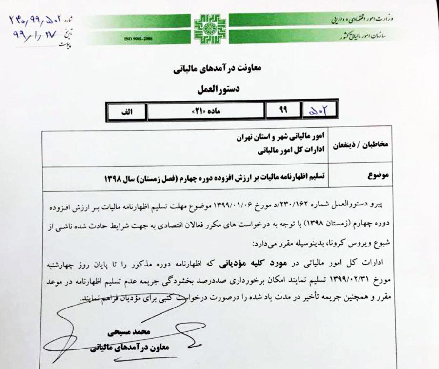 این بخشنامه که پیرو دستورالعملهای صادرشده در روز ششم فرودین ماه تدوین شده، روز 27 فروردین به تمامی ادارات کل مالیاتی ابلاغ شده است. تصویر این بخشنامه را در زیر میبینید.